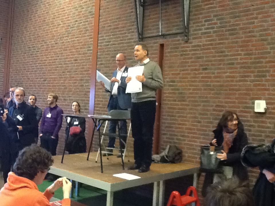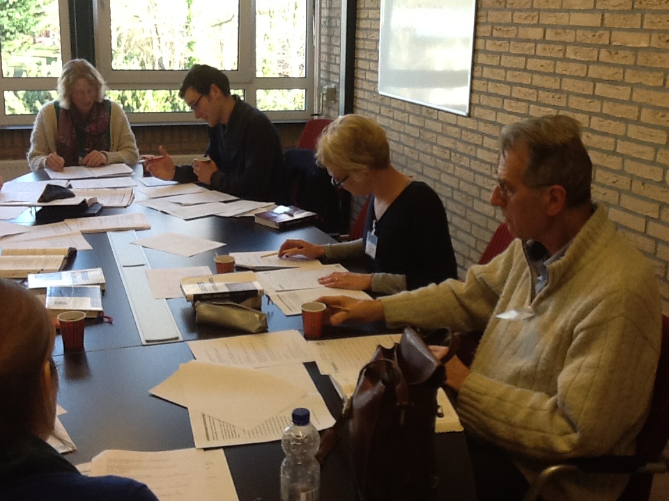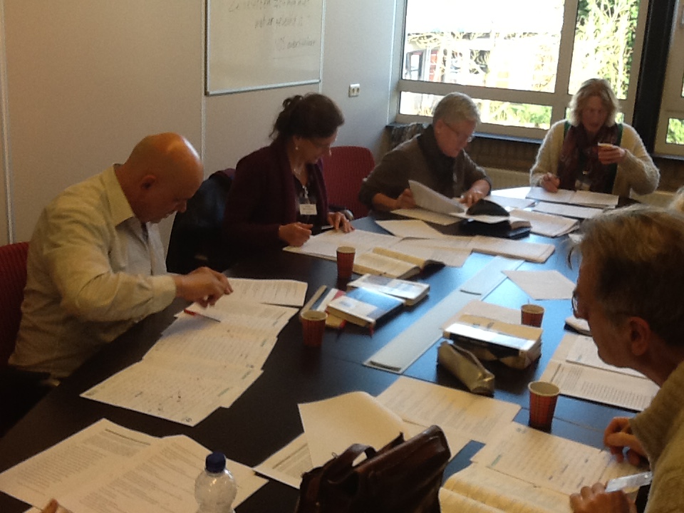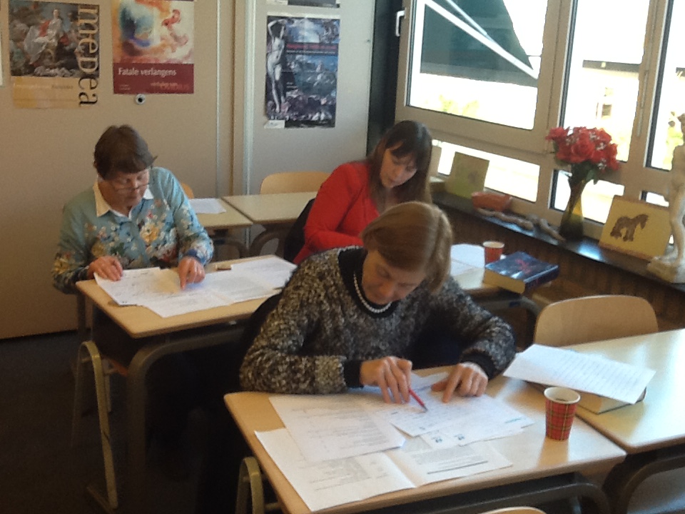 Parallel aan het leerlingenprogramma hadden de collega’s in de ochtend een workshop Latijn en in de middag een symposium over de integratie van klassieke talen en cultuur en hoe de diverse scholen en individuen dat aanpakten. Een hele grote groep collega’s trok zich echter terug voor een middagje stevig strepen in de producten van de bijna-studenten. Al die 93 exemplaren moeten immers correct nagekeken worden? Een kolossale klus die elk jaar het stoom uit de oren doet slaan van de correctoren. Maar ze zijn er opnieuw in geslaagd alles af te hebben rond 16.00 uur. Complimenten!