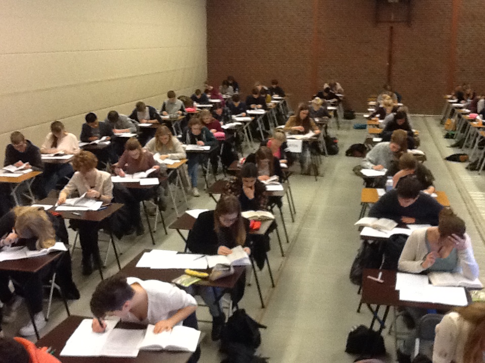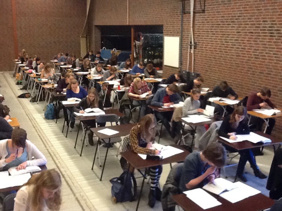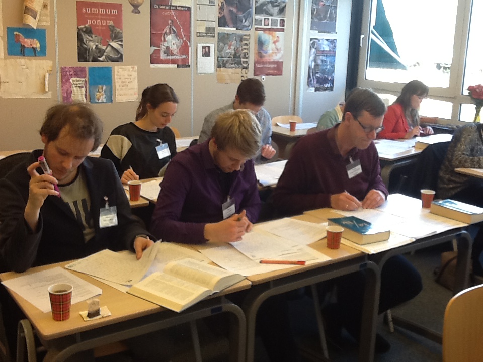 Al snel vulde zich de aula met maar liefst 93 vijfde- en zesdeklassers en 35 collega’s, die op zeker moment allemaal keurig klaar zaten voor een feestelijke openingsact van het Noord Nederlands Toneel: een impressie van hun nieuwe voorstelling “Borgen”. Daarna allemaal aan het werk! Hoogleraren prof. dr. Annette Harder voor Grieks en prof. dr. Ruurd Nauta voor Latijn waren er onder aansturing van dr. Remco Regtuit opnieuw in geslaagd een geschikte tekst te vinden en leidden deze zelf in voor het front van de bloem der natie die in de gymzaal in gespannen afwachting aanhoorde. Voor Grieks moest een pars uit Euripides (“Kinderen van Heracles 407-424) vertaald worden en voor Latijn stond een stuk uit Seneca op het menu (“Suasoriae 6.17). Voldoende voor twee klokuren kraken van hersenen, knagen op pennen, bestuderen van plafondlampen en bladeren in woordenboeken.